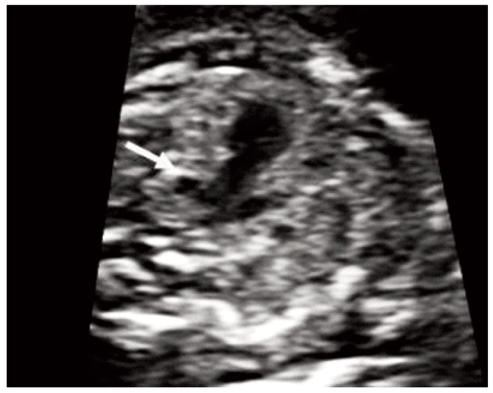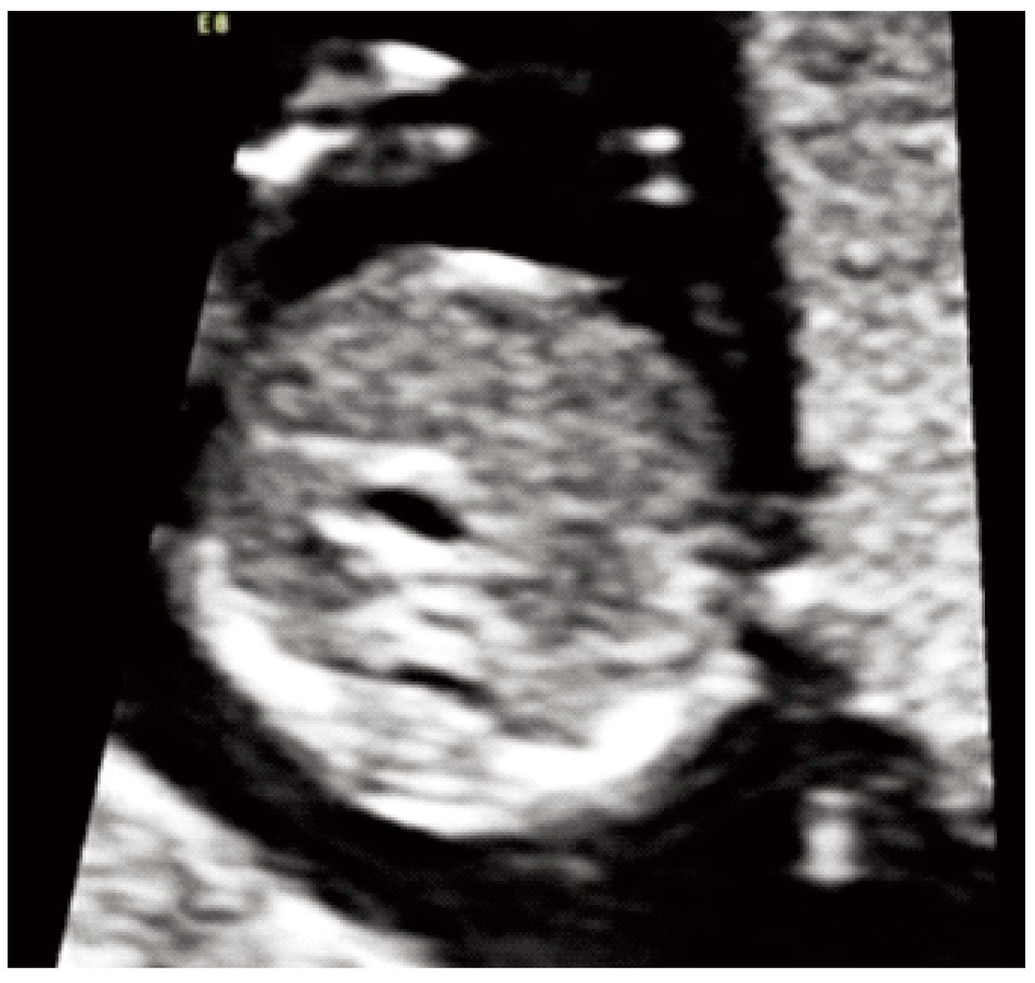 Her first pregnancy resulted in a healthy term infant. The fetus was normally grown (CRL=68.5 mm) and nuchal translucency was 2.4 mm.