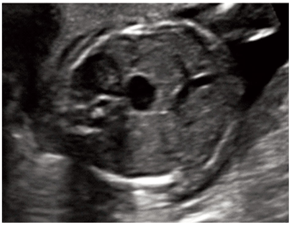 Figure 2. Cross‐sectional view of the fetal abdomen at 17 gestational weeks with the stomach positioned centrally.