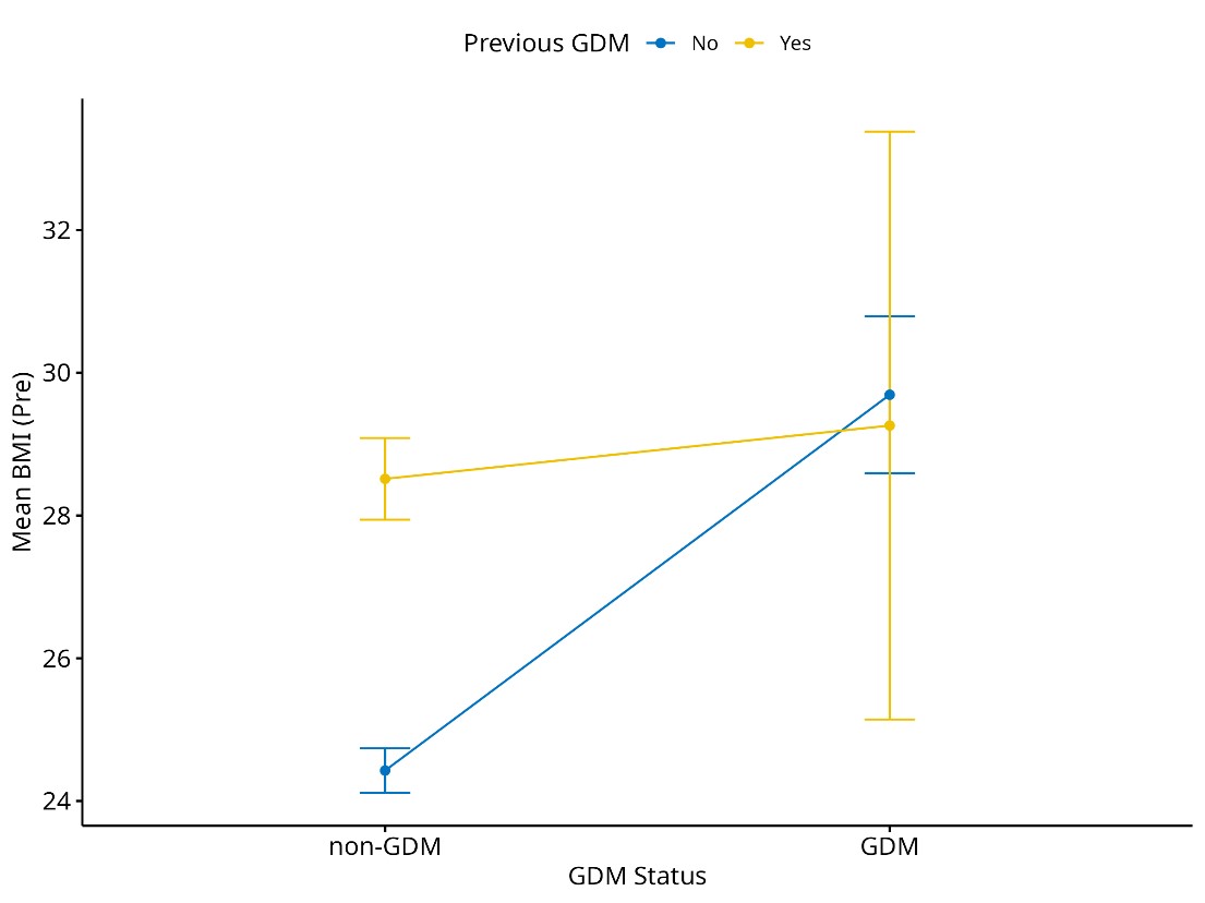 Figure 1 demonstrates the relationship between previous GDM history and current GDM status with mean pre-pregnancy BMI. Non-GDM women without a previous history of GDM have a lower pre-pregnancy BMI (around 24 to 26) compared to non-GDM women with history of GDM. Women with current GDM and a previous history of GDM exhibit no difference in BMI before pregnancy compared to GDM women without a history of previous GDM. The difference in BMI between the non-GDM women with no previous history of GDM and current GDM with no previous GDM history is more pronounced compared to the non-GDM women with a history of GDM and current GDM women with a history of GDM.