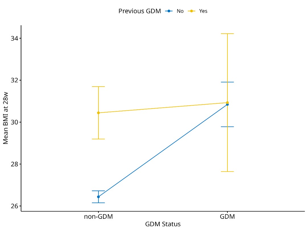 Figure 3. Mean BMI at 28 weeks of pregnancy by GDM status and previous GDM history.