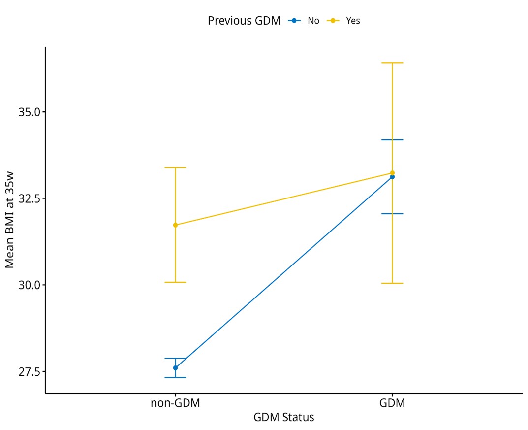 Figure 3 shows the relationship between previous GDM history, current GDM status, and mean BMI at 35 weeks of pregnancy. Non-GDM women without a previous history of GDM have lower BMI at 35 weeks of pregnancy (around 27.5 to 28) compared to non-GDM women with history of GDM. Women with current GDM and a previous history of GDM show no difference in BMI at 35 weeks of pregnancy compared to GDM women without a history of previous GDM. The difference in BMI between the non-GDM women with no previous history of GDM and current GDM with no previous GDM history is more pronounced compared to the non-GDM women with a history of GDM and current GDM women with a history of GDM.