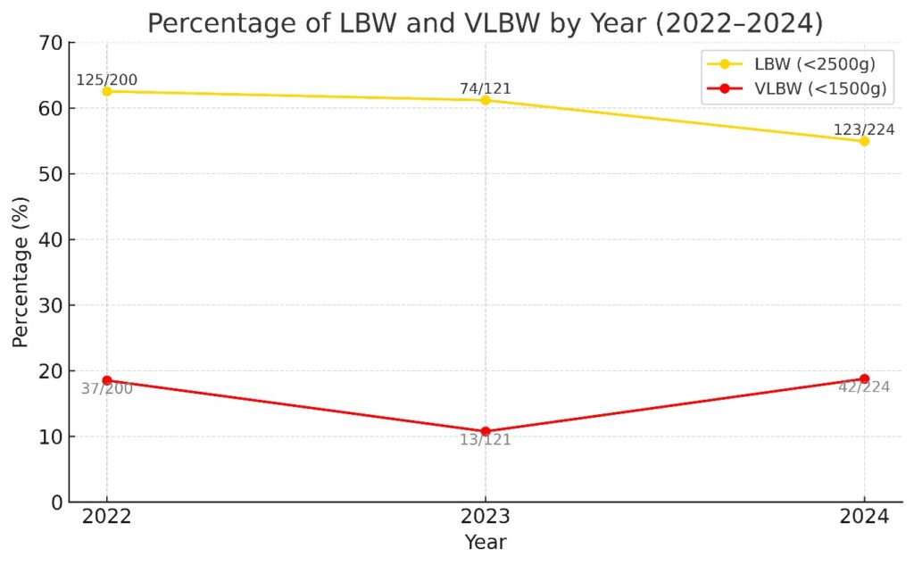 Figure 1: Annual distribution of LBW and VLBW admissions from 2022 to 2024.