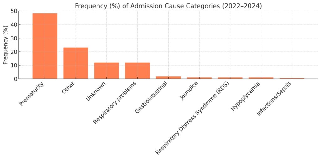 Prematurity was the leading cause of admission (48.0%) (Table 1). Respiratory problems (13.1%), other causes (21.9%), and unknown reasons (12.0%) followed. Less common were gastrointestinal issues (1.9%), jaundice (1.1%), RDS (1.1%), hypoglycemia (0.7%), and infections/sepsis (0.4%). Figure 2 displays the cause-specific distribution of admissions in percentage terms.