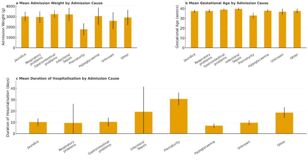 (a) Mean birthweight (grams), (b) mean gestational age (weeks), and (c) mean length of hospital stay (days) across different admission causes. Categories include jaundice, respiratory problems, gastrointestinal conditions, infection/sepsis, prematurity, hypoglycaemia, unknown, other. Error bars indicate the standard deviation (SD) in panels a and b, and the 95% Confidence Interval (CI) in panel c.