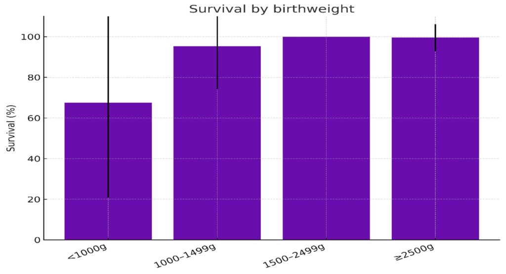 Figure 5: Survival by birthweight category. Error bars represent the standard deviation (SD).