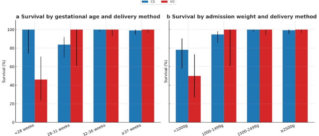 (a) Survival (%) by gestational age group and delivery type (CS: Cesarean section, VD: Vaginal delivery).