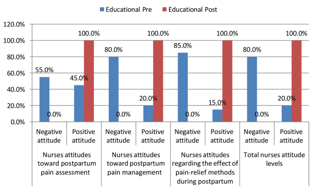 Table (5) & figure (1) shows that 55.0%, 80.0%, 85.0%, and 80.0% of nurses had negative attitudes regarding postpartum pain assessment, postpartum pain relief management, the effect of pain-relief methods during postpartum and total attitude levels before the intervention compared to after the intervention, about 100.0% of them had positive attitudes, respectively. There was a statistically significant difference in attitudes between before and after the intervention (P < 0.000).