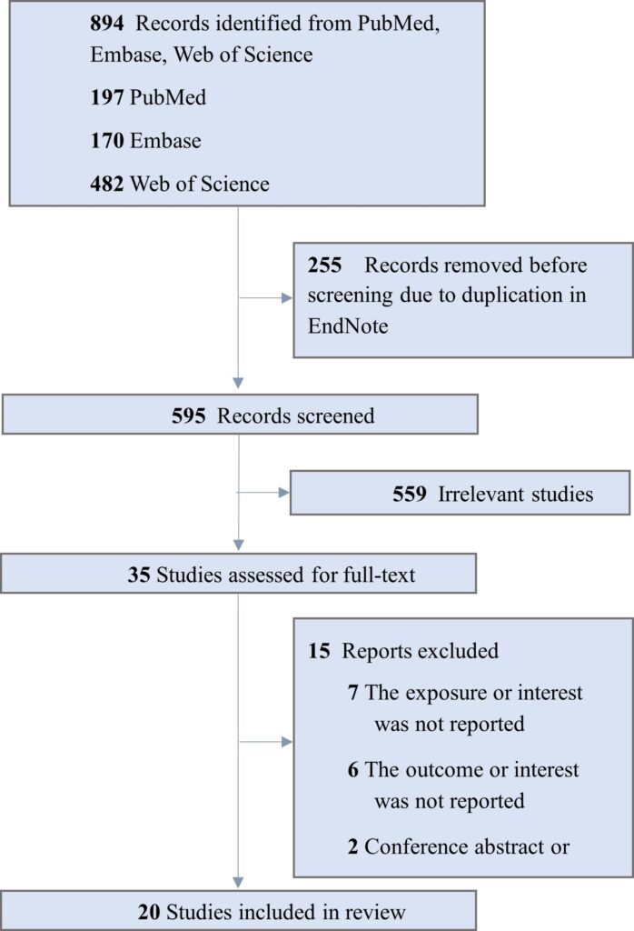 The initial database search yielded 894 records, of which 594 remained after duplicate removal (Figure 1). Following screening of titles and abstracts, 36 full-text articles were assessed for eligibility. Ultimately, 20 studies met the inclusion criteria and were incorporated into this systematic review. These studies were published between 1999 and 2023, representing a cumulative sample of over 20 pregnancies assessed for nuchal translucency in relation to congenital heart defects and other major structural anomalies.