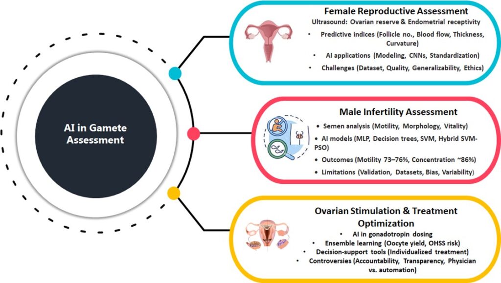 Infertility affects an estimated 15% of couples globally, posing both medical and psychosocial challenges. It is commonly defined as the inability to achieve conception after one year of regular, unprotected intercourse [1]. Male factors, often related to sperm dysfunction, contribute to nearly half of infertility cases, while female infertility is frequently associated with ovulatory disorders, tubal damage, or diminished ovarian reserve [2]. Conventional treatments—ranging from ovulation induction and intrauterine insemination (IUI) to in vitro fertilization (IVF)—have improved outcomes but remain limited by high costs, variable success rates, and the inherent subjectivity of clinical decision-making. The growing volume of multimodal data in reproductive medicine—including electronic health records, hormone profiles, medical imaging, genomics, and time-lapse embryology—has created opportunities for computational approaches. Traditional statistical models, while valuable, often fail to capture the complex nonlinear relationships among clinical variables. AI, encompassing machine learning (ML), deep learning (DL), and NLP, offers a paradigm shift by enabling predictive modeling and automated decision support [3]. Early studies have demonstrated the potential of AI to enhance ART outcomes. Convolutional neural networks (CNNs) have been applied to embryo imaging, achieving higher predictive accuracy than manual assessment [4]. Supervised ML models such as random forests, support vector machines (SVM), and artificial neural networks (ANNs) have been employed to predict IVF success, sperm morphology, and fertilization potential [5]. Reinforcement learning techniques are under investigation for optimizing ovarian stimulation and surgical planning. However, challenges persist, including limited clinical validation, algorithmic bias, interpretability issues, and the need for standardized regulatory frameworks. This review, therefore, examines computational methods, clinical applications, and ethical implications of AI in ART, with an emphasis on nuanced challenges and algorithmic innovations that shape its translation into real-world practice.